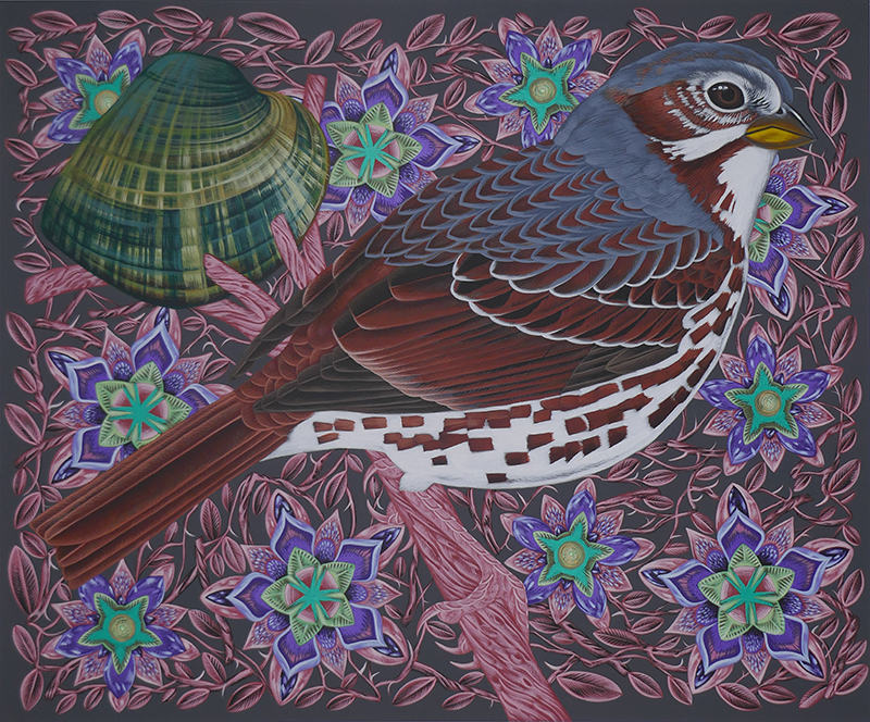 Fox Sparrow on Late Aster with Deertoe Mussel
