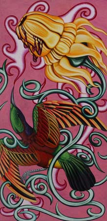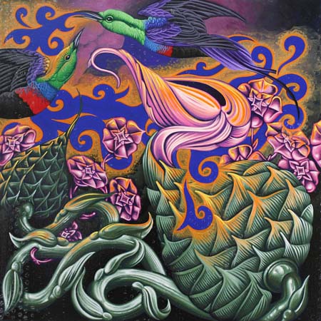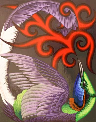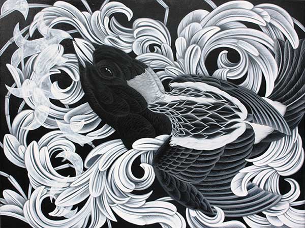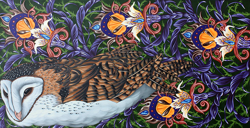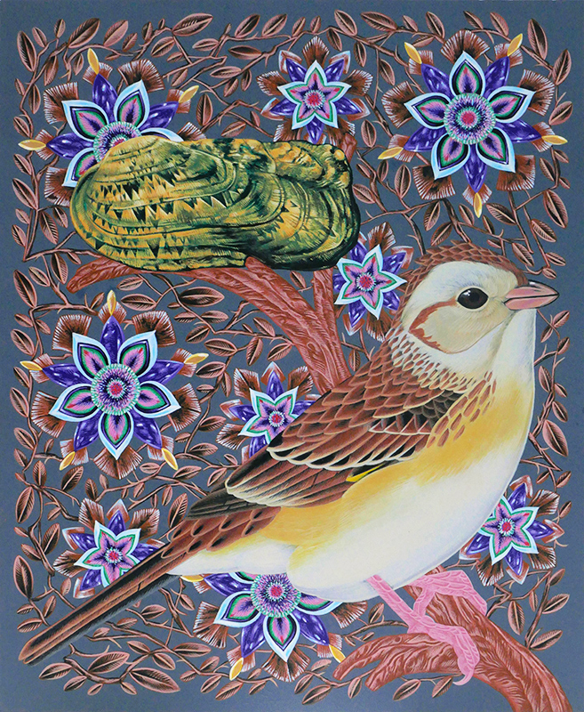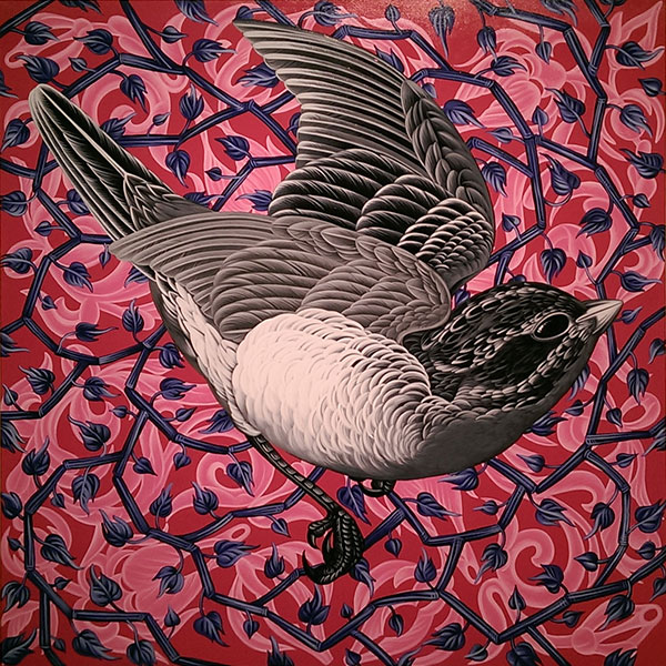 My artwork reflects the inspiration I receive from the arrival of birds in their seasonal and geographical movement. My paintings are observations easily dismissed; an homage to the overlooked and the beauty underfoot. My use of color and pattern exemplify the joy I receive in that observation. I rarely know what my next painting will be. When a bird shows up on my property, their image and the flowers surrounding them reflect my joy and welcome of their arrival.